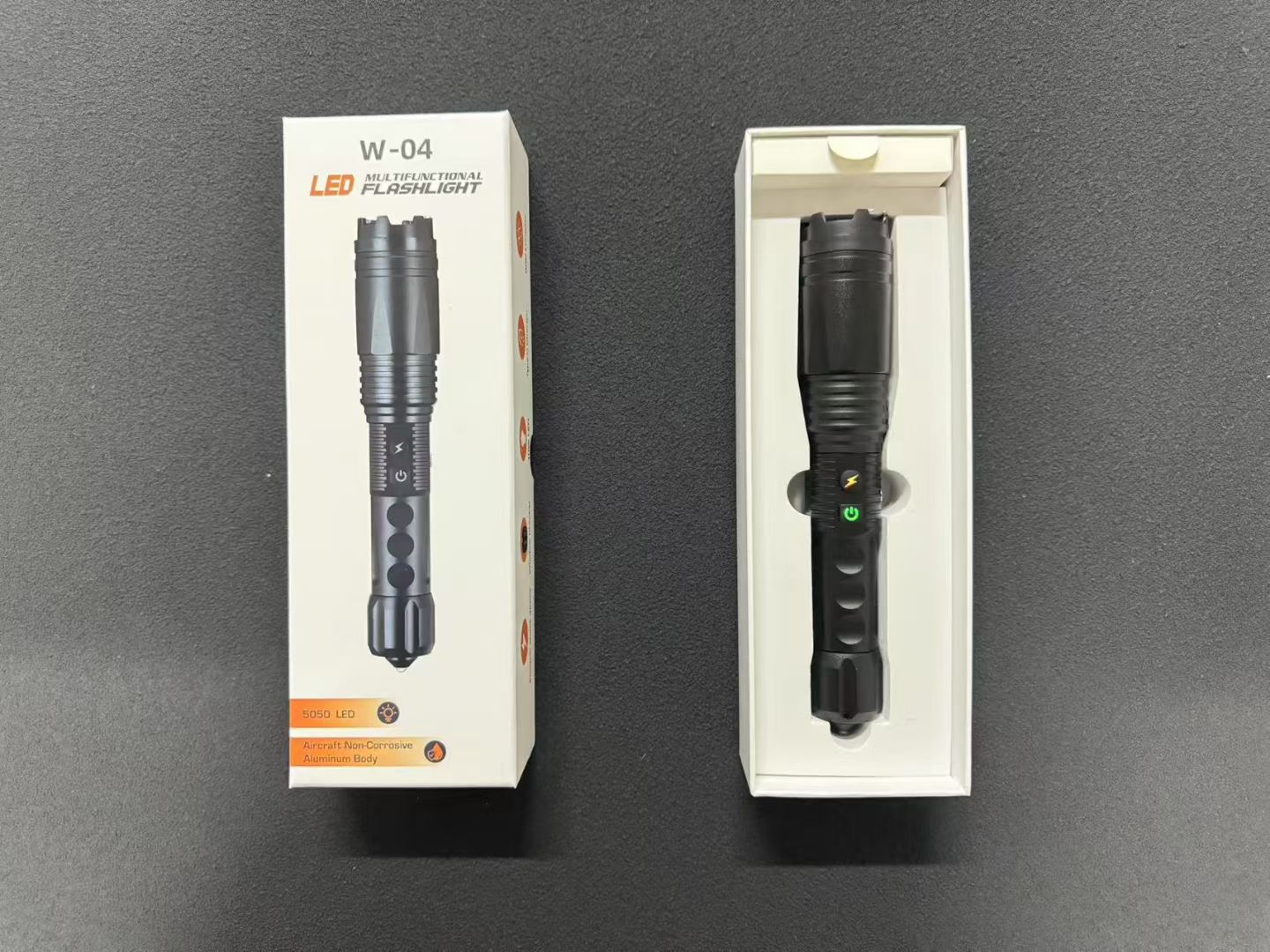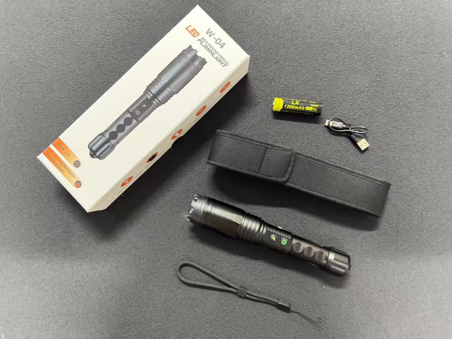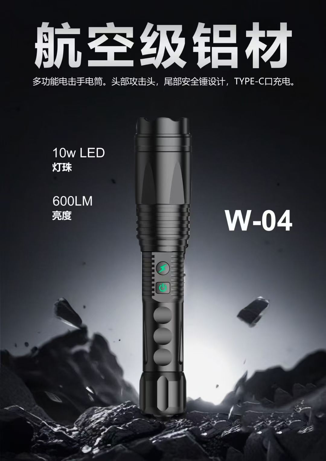 特点10W-LED灯珠,亮度600流明<br/>聚光直射可达800米,电压 70000KV 航空级铝材,攻击头,18650电池<br/>TYPE-C充电口,尾部破窗珠设计